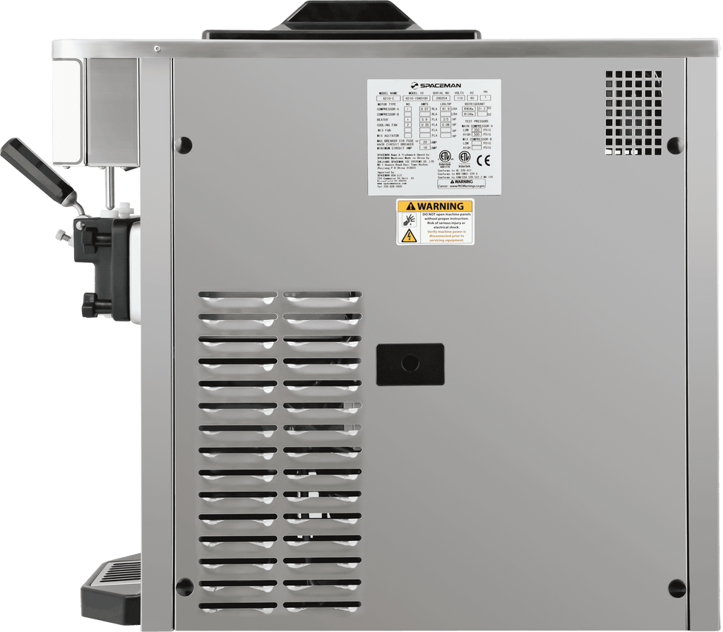 The 6210-C incorporates Spaceman’s patented 100% Controlled Contact Flooded Evaporator, designed for maximum efficiency and delivering the industry’s fastest freeze-down and recovery times with smaller ice crystals and the smoothest, creamiest mouthfeel. Continuous improvements in design, driven by field feedback and R&D, enhance operational efficiency, structural integrity, and serviceability. The advanced V5 single-piece auger ensures full evaporator wall contact, eliminates unnecessary parts, reduces cleaning time, and further enhances consistency with the smallest ice crystals in the industry. Smart safety controls and independent standby modes maintain hopper and cylinder temperatures below 4.4ºC (40ºF), optimizing energy efficiency and product quality during non-use. Finally, the dual-system gravity-fed air inlet works in tandem with the V5 auger to deliver the most consistent overrun, ensuring long-term texture and superior product quality.
