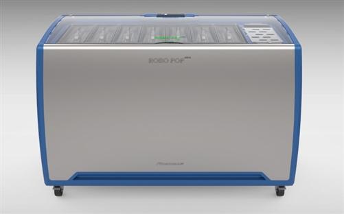 The Robopop Ultra is a semi-automatic professional machine for freezing and detaching water-based (pineapple, lemon, etc.) or milk (chocolate, vanilla, etc.) popsicles.